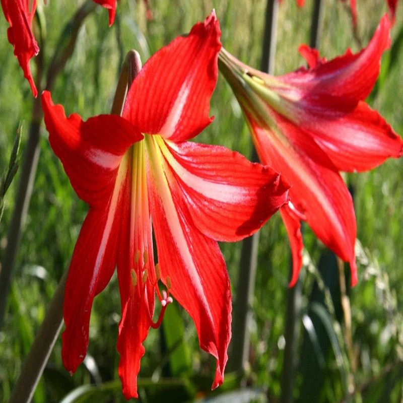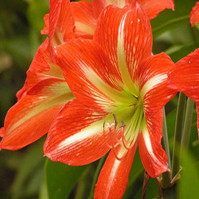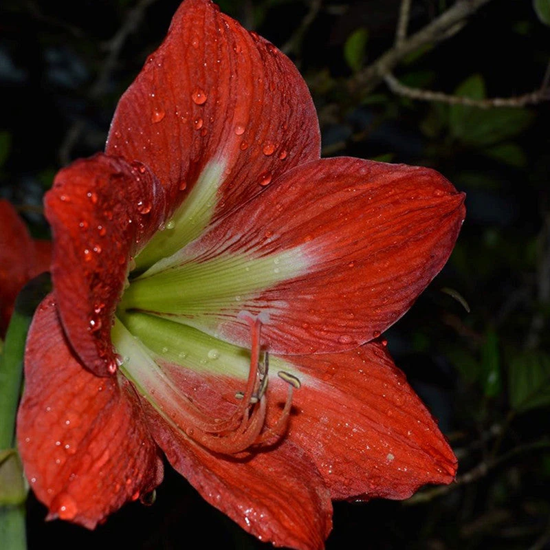 Amaryllis lily is popular for its trumpet-shaped flowers, itย is aย bulbousย plant. It has several strap-shaped,ย hysteranthous,ย green leavesย with midribย 30โ50ย cm long and 2โ3ย cm broad, arranged in two rows.ย They are produced in the autumn or early spring in warm climates depending on the onset of rain and eventually die down by late spring. The bulb is then dormant until late summer. The plant is not frost-tolerant, nor does it do well in tropical environments since they require a dry resting period between leaf growth and flower spike production.