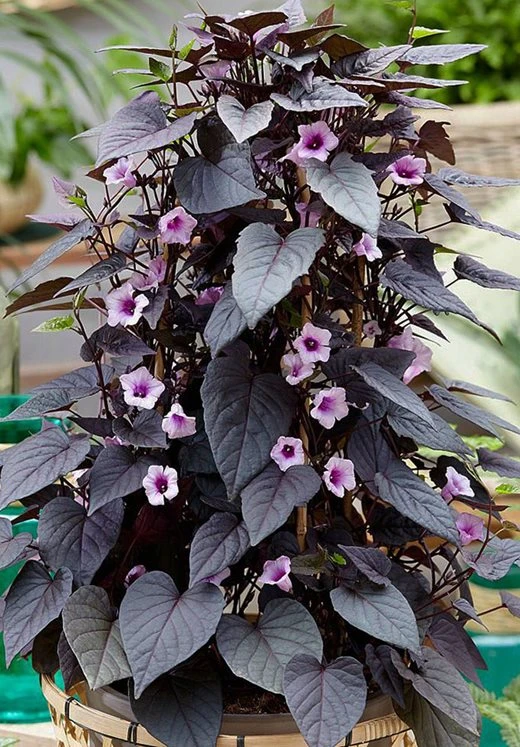 Ipomoeaย Black heart vine is a compact, warm weather annual and in cooler climate it is perennial, and is commonly known as the sweet potato vineย plant.ย Ipomoeaย grows best in moist, fertile, well-drained soil, and it need full to partial sun.ย Ipomoeas also make great annual groundcovers in the landscape. They love the heat and humidity cooler temperatures and low humidity cause them to stay more compact. You can grow them whether in hanging basket, pot, also directly in the ground. But always remember the scorching sun can cause the leaf burn, so protect the plant if temperature is above 35 degree celsius. As it is from the same family of sweet potato it’s tuber is not edible because it doesn’t have any sugar content and mainly grown for its foliage purpose.