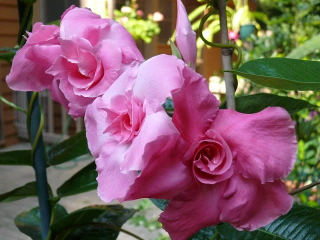 Mandevillas develop spectacular, often fragrant flowers in warm climates. The flowers come in a variety of colours, including white, pink, yellow, and red. Mandevilla vines need some shade. They enjoy bright, indirect light or filtered sunlight, but can get burned in direct, full sunlight.